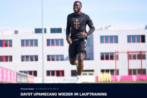 体育资讯4月9日讯 拜仁官方消息,后卫于帕梅卡诺恢复跑步训练。